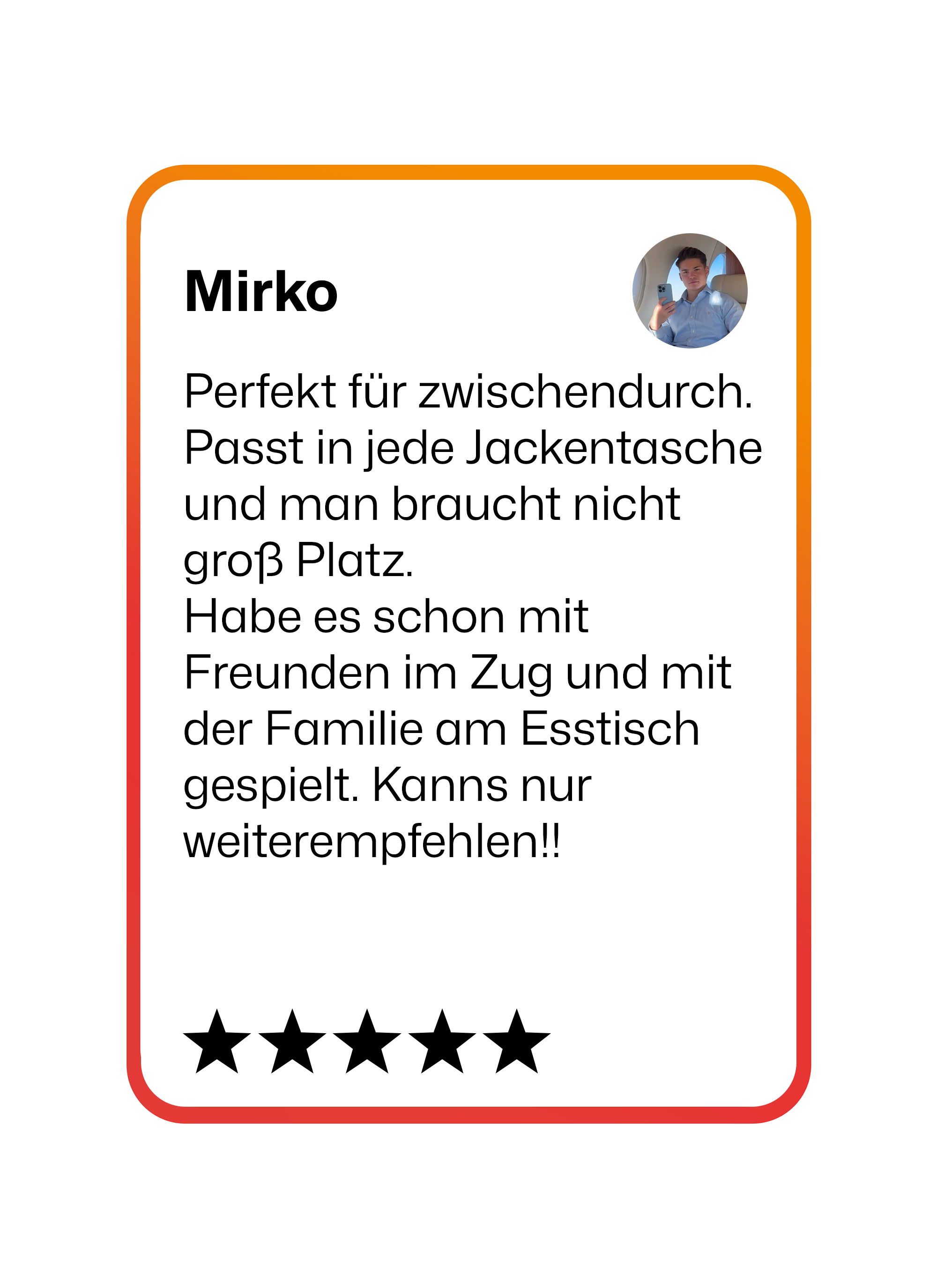Wer sagt die Wahrheit – und wer spielt euch perfekt etwas vor? In diesem schnellen Partyspiel versucht eine Person heimlich, den gesuchten Begriff zu erraten, während alle anderen genau wissen, worum es geht. Bluffen, verwirren, taktieren – wer entlarvt den Hochstapler? Mit den Actionkarten wird es noch chaotischer: Unerwartete Wendungen, neue Regeln und mehr Lacher.